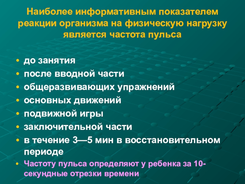 Слайд 31Наиболее информативным показателем реакции организма на физическую нагрузку является частота пульса
