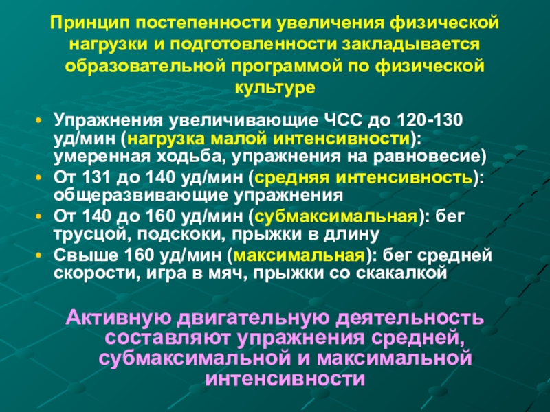 Слайд 37Принцип постепенности увеличения физической нагрузки и подготовленности закладывается образовательной программой по