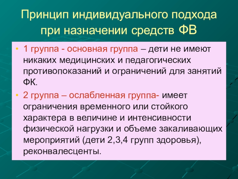 Слайд 38Принцип индивидуального подхода при назначении средств ФВ