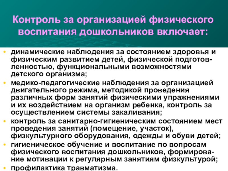 медико-педагогические наблюдения за организацией двигательного режима, методикой проведения различных форм занятий физическими упражнениями и их воздействием на организм ребенка, контроль за осуществлением системы закаливания;