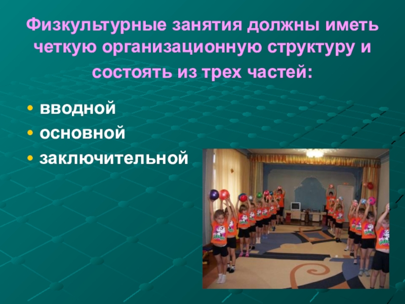 Слайд 22Физкультурные занятия должны иметь четкую организационную структуру и состоять из трех