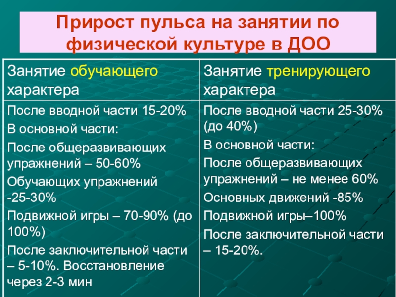 частоты пульса на занятии физической культурой, которые подразделяются на: занятия обучающего и тренирующего характера.