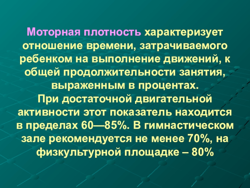 Слайд 30Моторная плотность характеризует отношение времени, затрачиваемого ребенком на выполнение движений, к