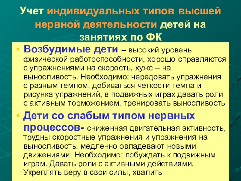 Слайд 39Учет индивидуальных типов высшей нервной деятельности детей на занятиях по ФК