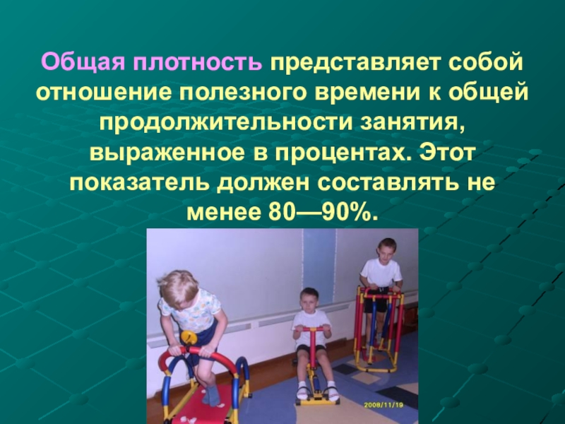 Слайд 29Общая плотность представляет собой отношение полезного времени к общей продолжительности занятия,