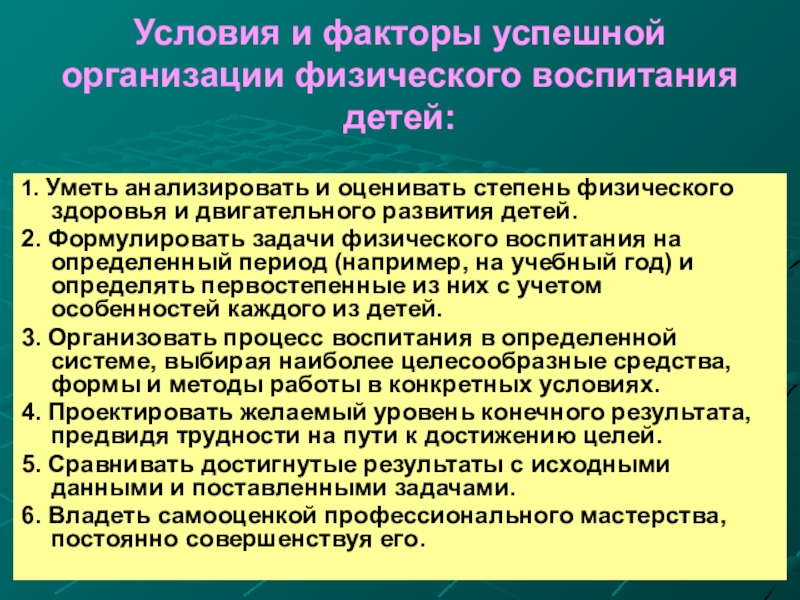 Слайд 13Условия и факторы успешной организации физического воспитания детей: