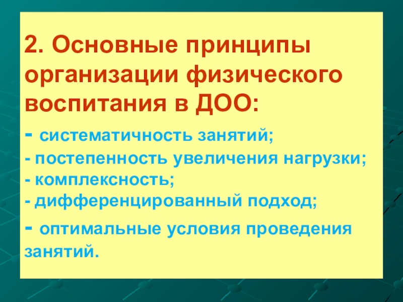 Слайд 142. Основные принципы организации физического воспитания в ДОО: