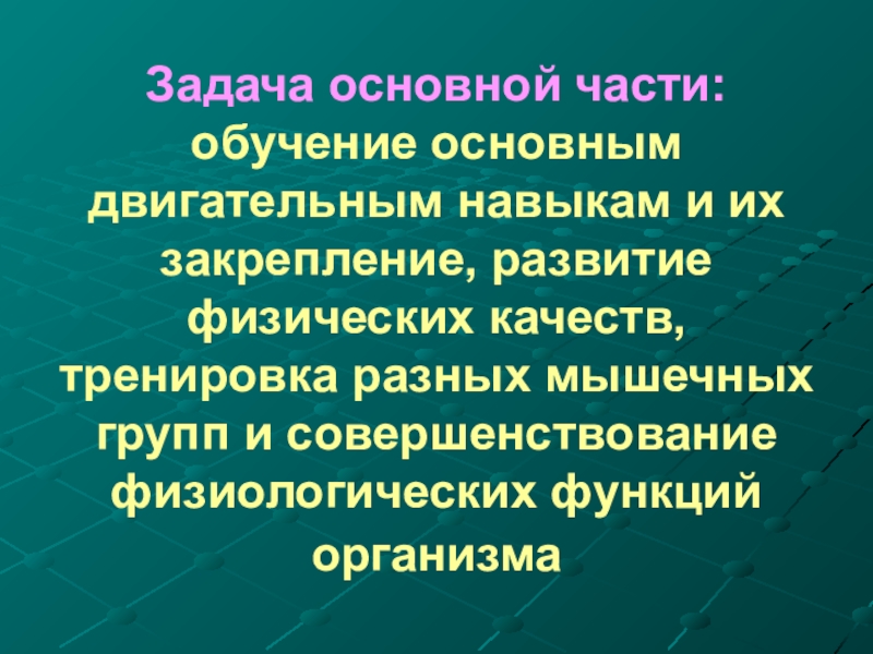Слайд 24Задача основной части: обучение основным двигательным навыкам и их закрепление, развитие