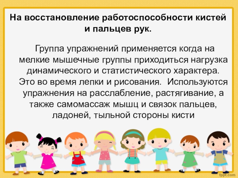 мелкие мышечные группы приходиться нагрузка динамического и статистического характера. Это во время лепки и рисования. Используются упражнения на расслабление, растягивание, а также самомассаж мышц и связок пальцев, ладоней, тыльной стороны кисти