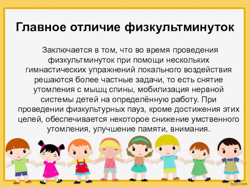 помощи нескольких гимнастических упражнений локального воздействия решаются более частные задачи, то есть снятие утомления с мышц спины, мобилизация нервной системы детей на определённую работу. При проведении физкультурных пауз, кроме достижения этих целей, обеспечивается некоторое снижение умственного утомления, улучшение памяти, внимания.