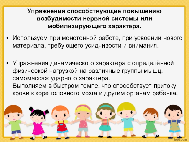 Упражнения динамического характера с определённой физической нагрузкой на различные группы мышц, самомассаж ударного характера. Выполняем в быстром темпе, что способствует притоку крови к коре головного мозга и другим органам ребёнка.