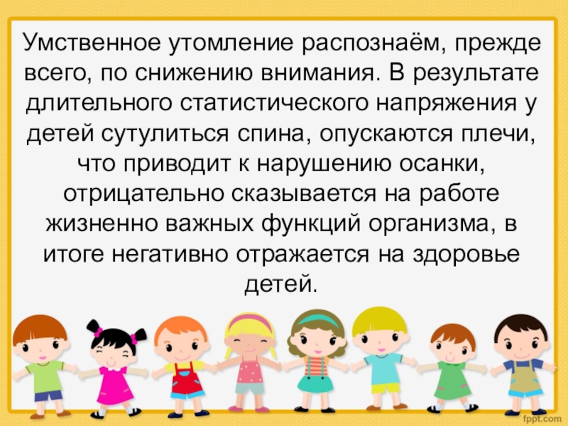 статистического напряжения у детей сутулиться спина, опускаются плечи, что приводит к нарушению осанки, отрицательно сказывается на работе жизненно важных функций организма, в итоге негативно отражается на здоровье детей.