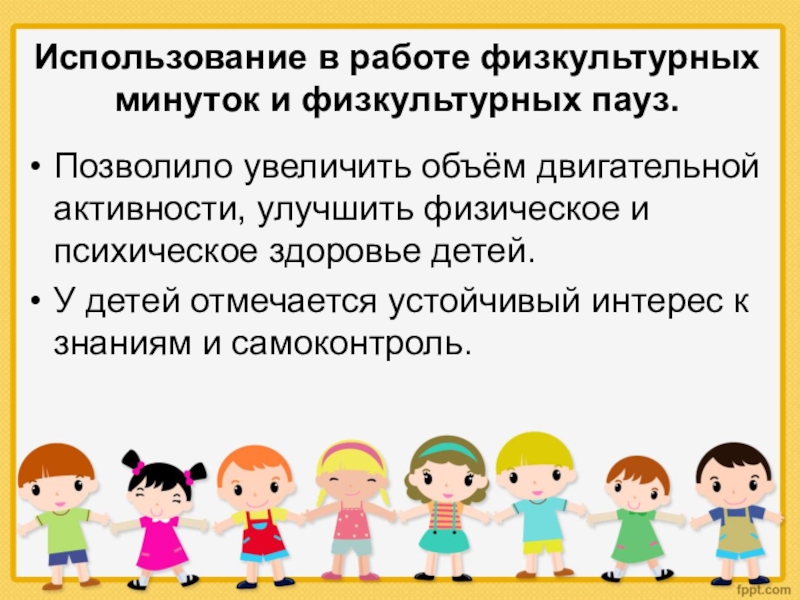 Слайд 57Использование в работе физкультурных минуток и физкультурных пауз.
