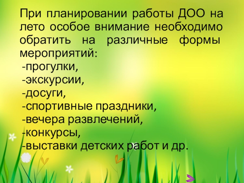 Слайд 5При планировании работы ДОО на лето особое внимание необходимо обратить на