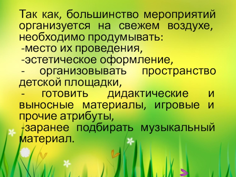 Слайд 4Так как, большинство мероприятий организуется на свежем воздухе, необходимо продумывать: