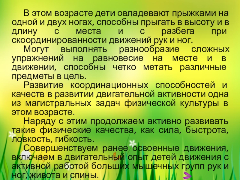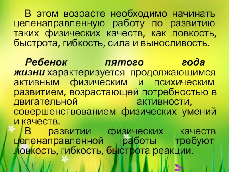 Слайд 10В этом возрасте необходимо начинать целенаправленную работу по развитию таких физических