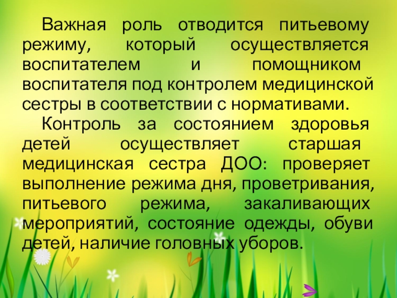 Слайд 7Важная роль отводится питьевому режиму, который осуществляется воспитателем и помощником воспитателя