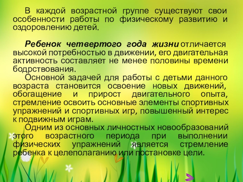 Ребенок четвертого года жизни отличается высокой потребностью в движении, его двигательная активность составляет не менее половины времени бодрствования.
