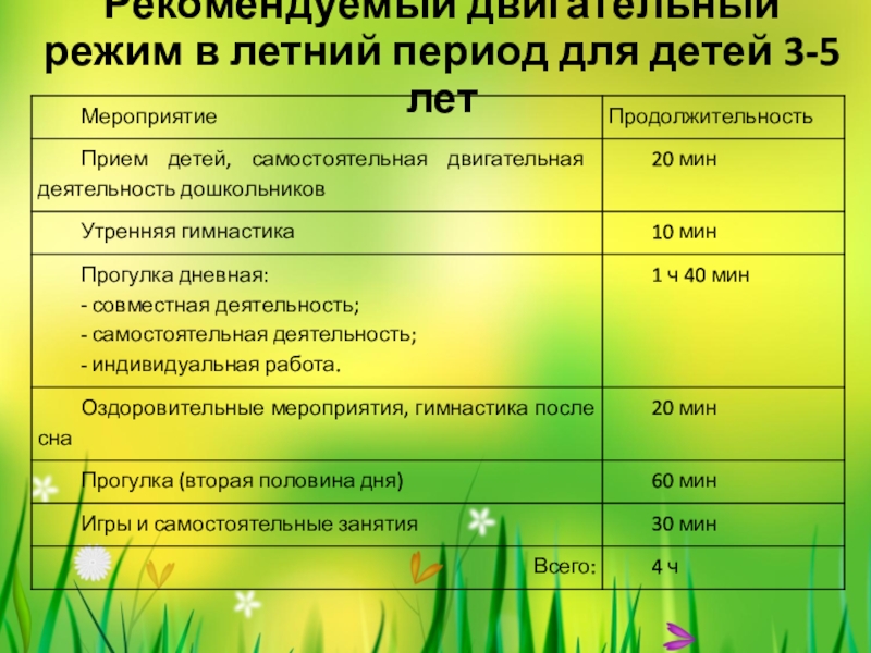 Слайд 11Рекомендуемый двигательный режим в летний период для детей 3-5 лет