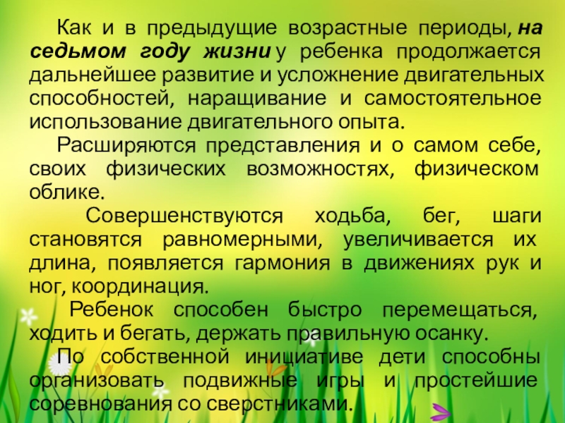 Слайд 14Как и в предыдущие возрастные периоды, на седьмом году жизни у ребенка продолжается