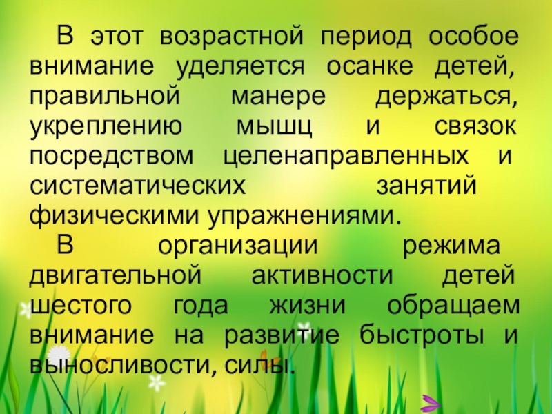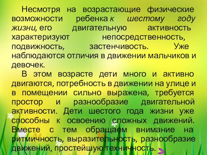 Слайд 12Несмотря на возрастающие физические возможности ребенка к шестому году жизни, его двигательную активность