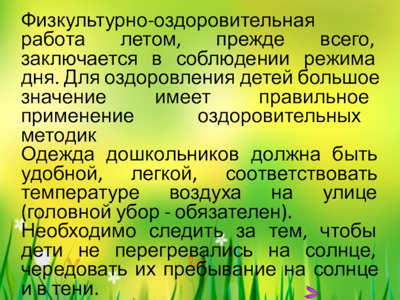 Слайд 6Физкультурно-оздоровительная работа летом, прежде всего, заключается в соблюдении режима дня. Для