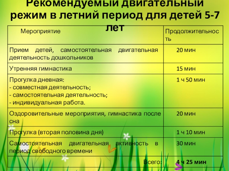 Слайд 16Рекомендуемый двигательный режим в летний период для детей 5-7 лет