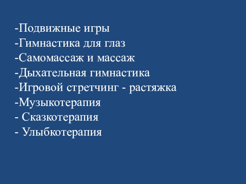 Слайд 10 -Подвижные игры -Гимнастика для глаз -Самомассаж и массаж -Дыхательная гимнастика -Игровой стретчинг - растяжка -Музыкотерапия -