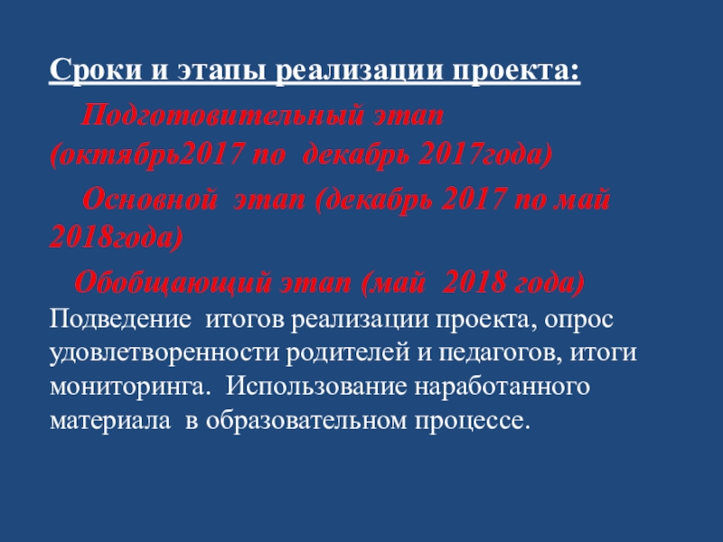 Сроки и этапы реализации проекта:  Подготовительный этап (октябрь2017 по декабрь 2017года)  Основной этап (декабрь 2017