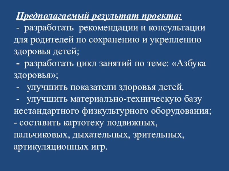 Предполагаемый результат проекта:  - разработать рекомендации и консультации для родителей по сохранению и укреплению здоровья