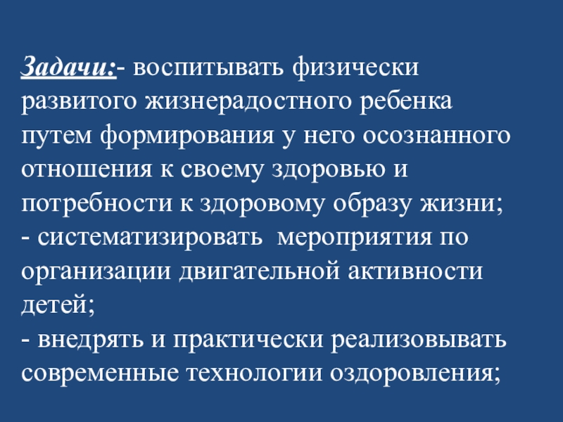 Слайд 4Задачи:- воспитывать физически развитого жизнерадостного ребенка путем формирования у него осознанного