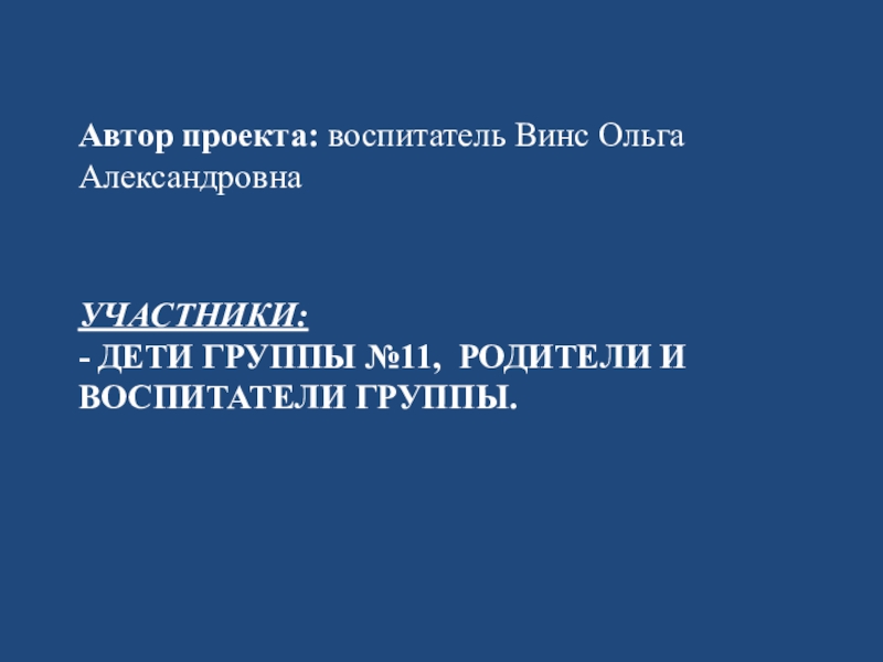 Участники: - дети группы №11, родители и воспитатели группы.Автор проекта: воспитатель Винс Ольга Александровна