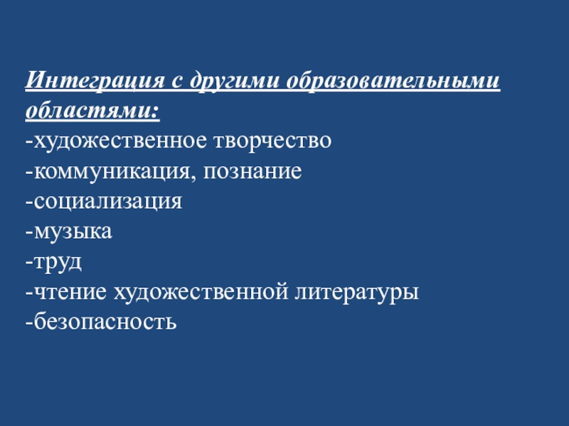 Интеграция с другими образовательными областями:-художественное творчество -коммуникация, познание-социализация -музыка -труд -чтение художественной литературы-безопасность