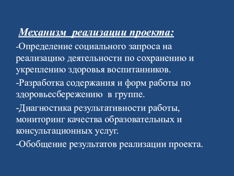 Механизм реализации проекта:-Определение социального запроса на реализацию деятельности по сохранению и укреплению здоровья воспитанников.-Разработка содержания и