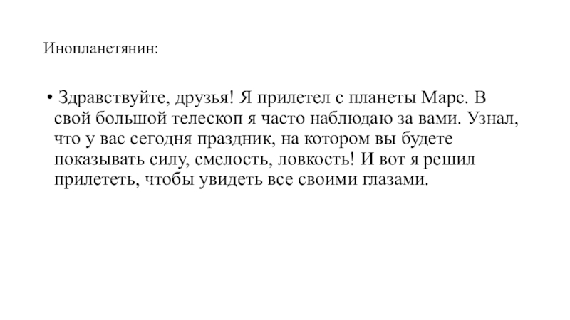 телескоп я часто наблюдаю за вами. Узнал, что у вас сегодня праздник, на котором вы будете показывать силу, смелость, ловкость! И вот я решил прилететь, чтобы увидеть все своими глазами.