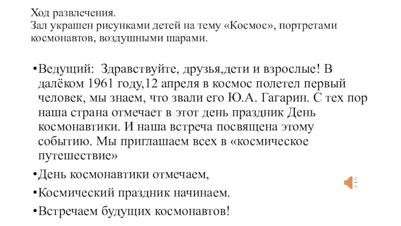 Ведущий: Здравствуйте, друзья,дети и взрослые! В далёком 1961 году,12 апреля в космос полетел первый человек, мы знаем, что звали его Ю.А. Гагарин. С тех пор наша страна отмечает в этот день праздник День космонавтики. И наша встреча посвящена этому событию. Мы приглашаем всех в «космическое путешествие»