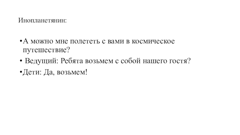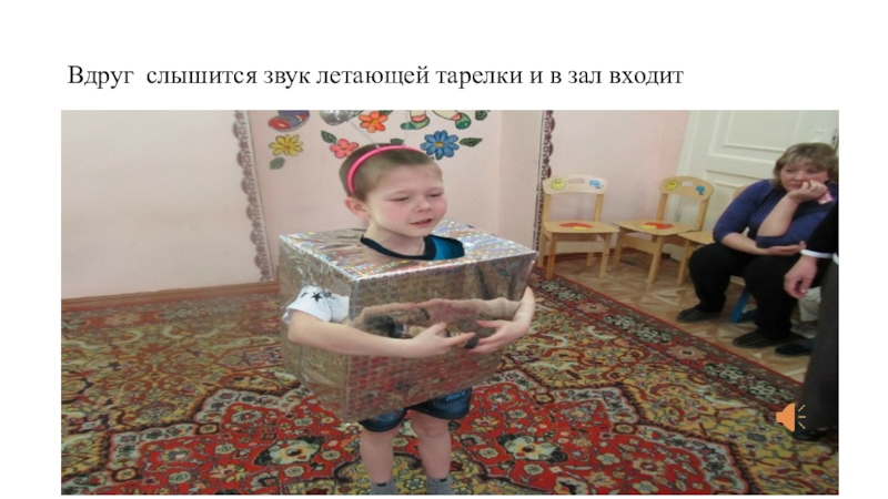 Слайд 8Вдруг слышится звук летающей тарелки и в зал входит