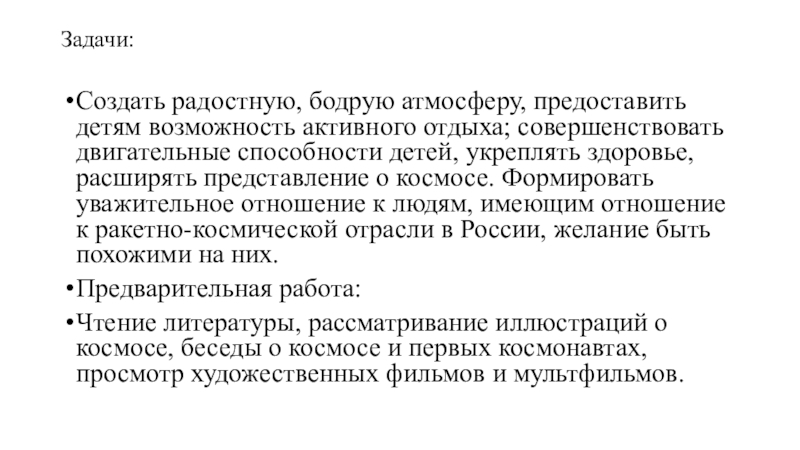 Создать радостную, бодрую атмосферу, предоставить детям возможность активного отдыха; совершенствовать двигательные