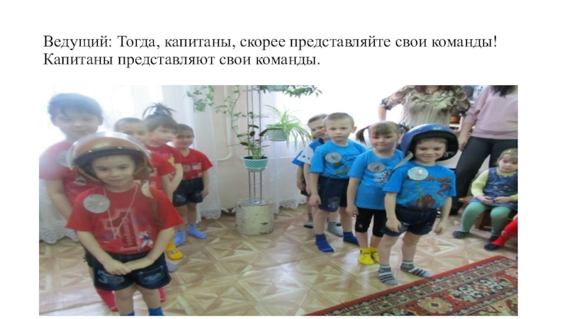 Слайд 12Ведущий: Тогда, капитаны, скорее представляйте свои команды!