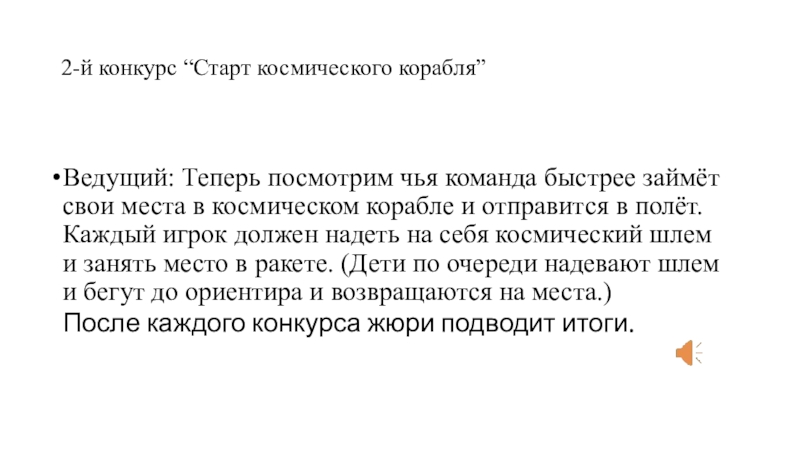 займёт свои места в космическом корабле и отправится в полёт. Каждый игрок должен надеть на себя космический шлем и занять место в ракете. (Дети по очереди надевают шлем и бегут до ориентира и возвращаются на места.) После каждого конкурса жюри подводит итоги.