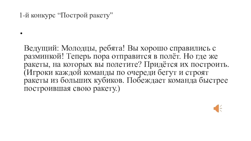 Теперь пора отправится в полёт. Но где же ракеты, на которых вы полетите? Придётся их построить. (Игроки каждой команды по очереди бегут и строят ракеты из больших кубиков. Побеждает команда быстрее построившая свою ракету.)