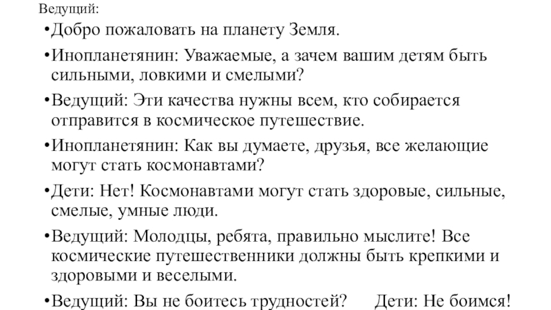Ведущий: Молодцы, ребята, правильно мыслите! Все космические путешественники должны быть крепкими и здоровыми и веселыми.