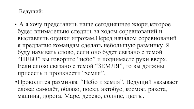 за ходом соревнований и выставлять оценки игрокам.Перед началом соревнований я предлагаю командам сделать небольшую разминку. Я буду называть слово, если оно будет связано с темой “НЕБО” вы говорите “небо” и поднимаете руки вверх. Если слово связано с темой “ЗЕМЛЯ”, то вы должны присесть и произнести “земля”.