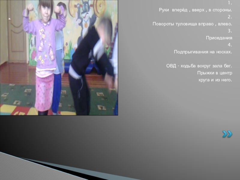 1.Руки вперёд , вверх , в стороны.2.Повороты туловища вправо , влево.3.Приседания4.Подпрыгивания на носках.  ОВД - ходьба