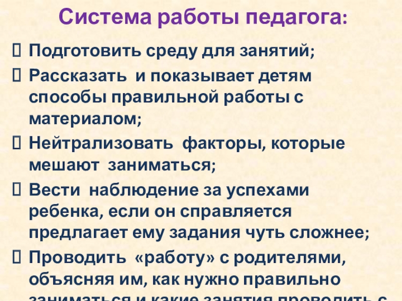 Развитие сенсорных (предметно-действенных) способов познания предметов, свойств и отношений: обследование, сопоставление, группировка, упорядочение, разбиение;