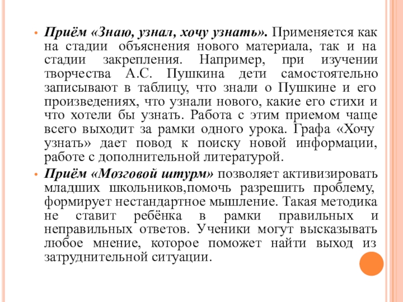 так и на стадии закрепления. Например, при изучении творчества А.С. Пушкина дети самостоятельно записывают в таблицу, что знали о Пушкине и его произведениях, что узнали нового, какие его стихи и что хотели бы узнать. Работа с этим приемом чаще всего выходит за рамки одного урока. Графа «Хочу узнать» дает повод к поиску новой информации, работе с дополнительной литературой.