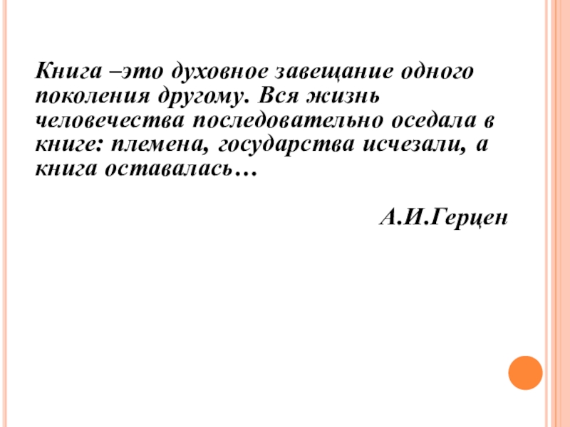 Слайд 2Книга –это духовное завещание одного поколения другому. Вся жизнь человечества последовательно