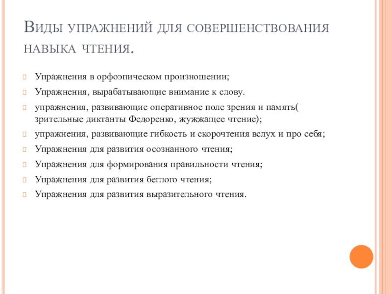 Слайд 9Виды упражнений для совершенствования навыка чтения.
