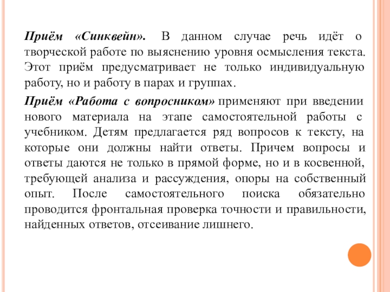 выяснению уровня осмысления текста. Этот приём предусматривает не только индивидуальную работу, но и работу в парах и группах.