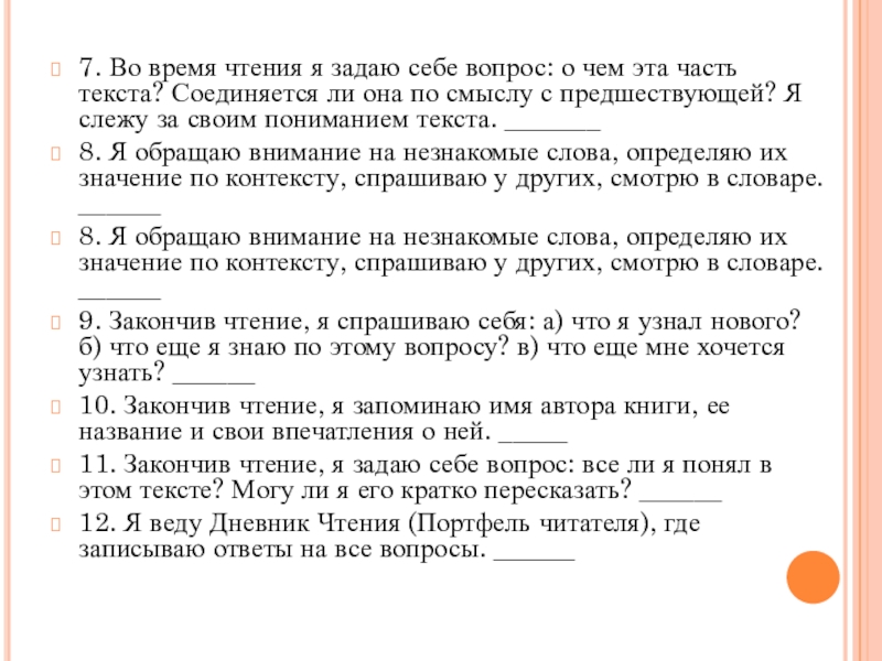 11. Закончив чтение, я задаю себе вопрос: все ли я понял в этом тексте? Могу ли я его кратко пересказать? ______